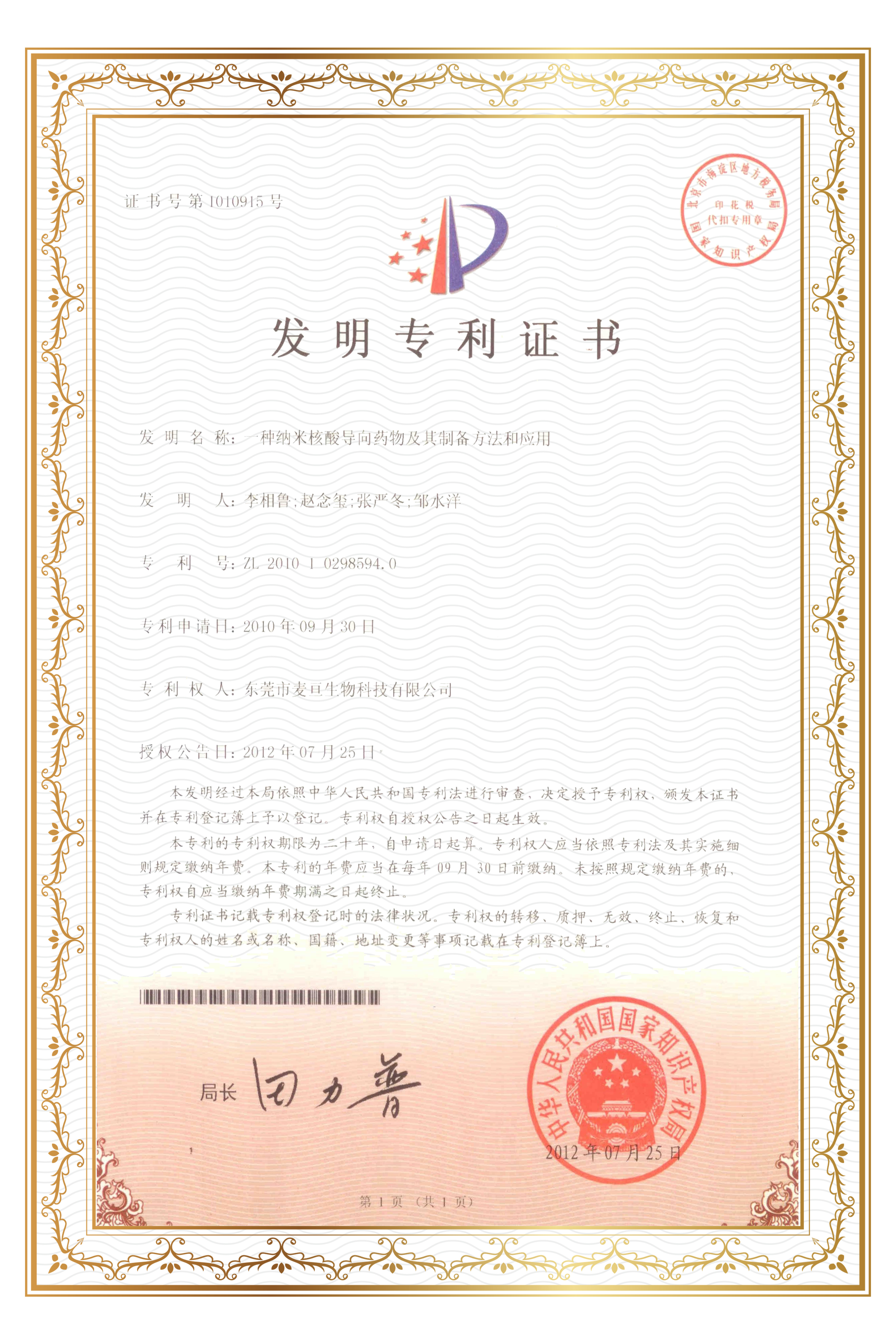 專(zhuān)利技術(shù):一種納米核酸導向藥物及其制備方法和應用 -